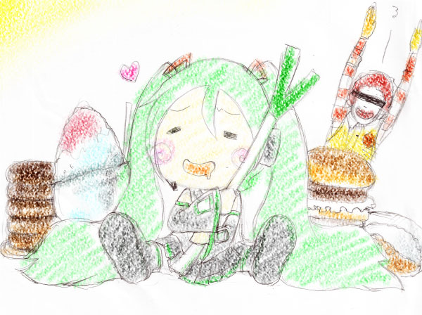 友人に可愛いミク動画を教えてもらったので描いてみた。 教えていただいた動画↓ ■【ニコニコ動画】【初音ミク】ドルアーガの塔より「おなかすいたうた」 ■【ニコニコ動画】【初音ミク】おいしいプレゼント ちなみに、ミクの後ろに何かピエロ風味の人間が見える方(オイラも含めて)はドナルド中毒です。 早めに病院にいきましょう(=▽=)(何 |