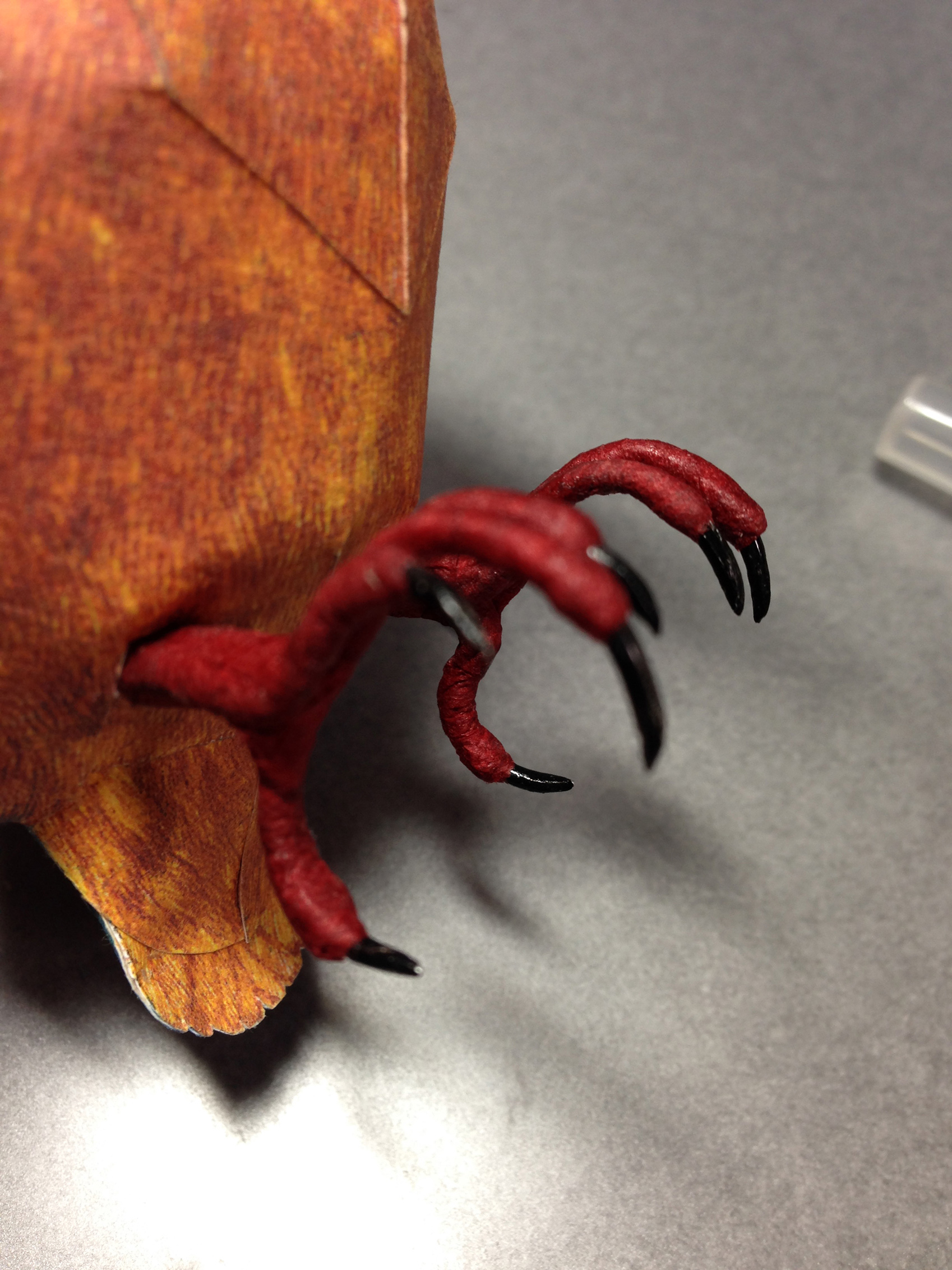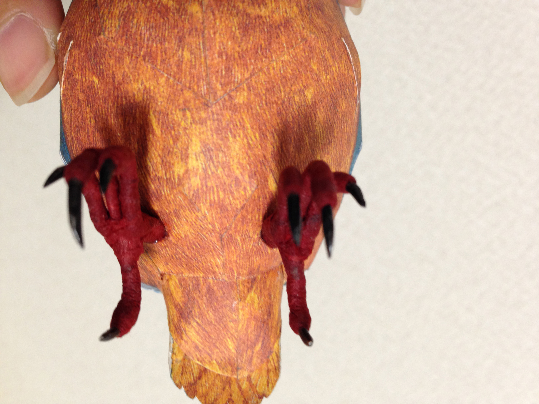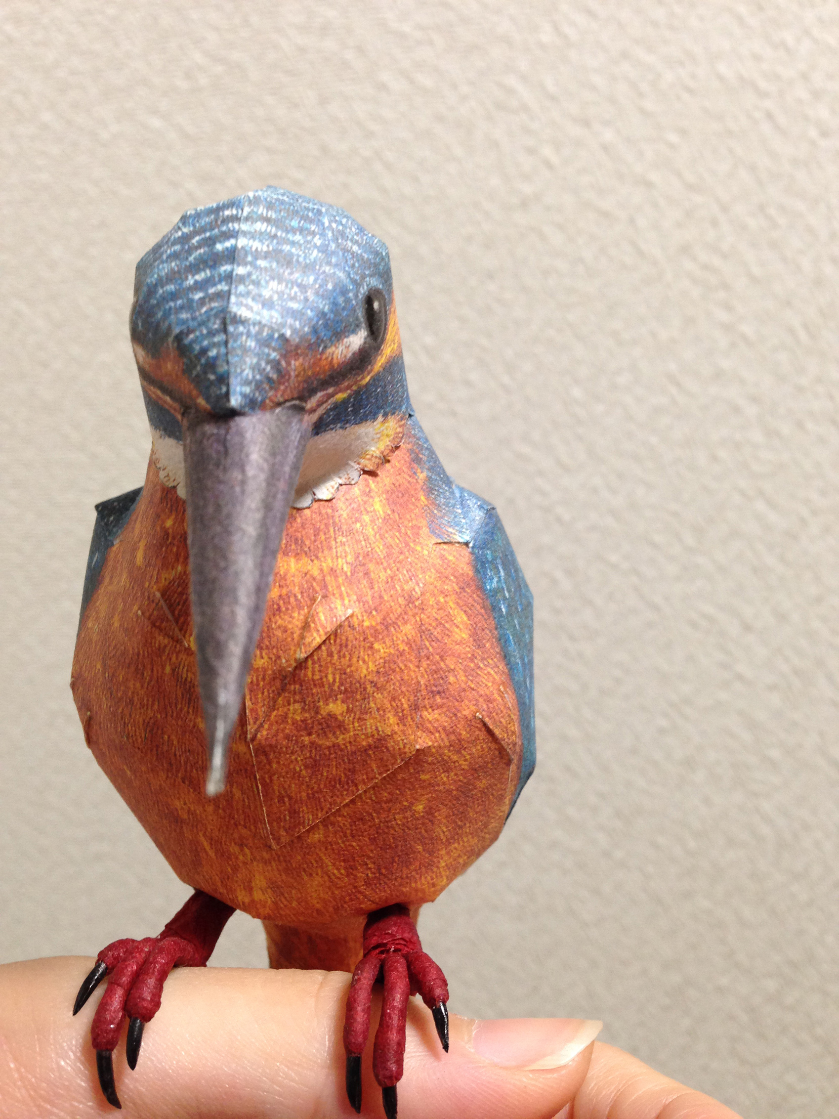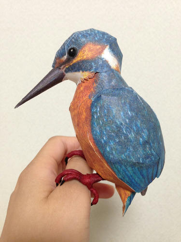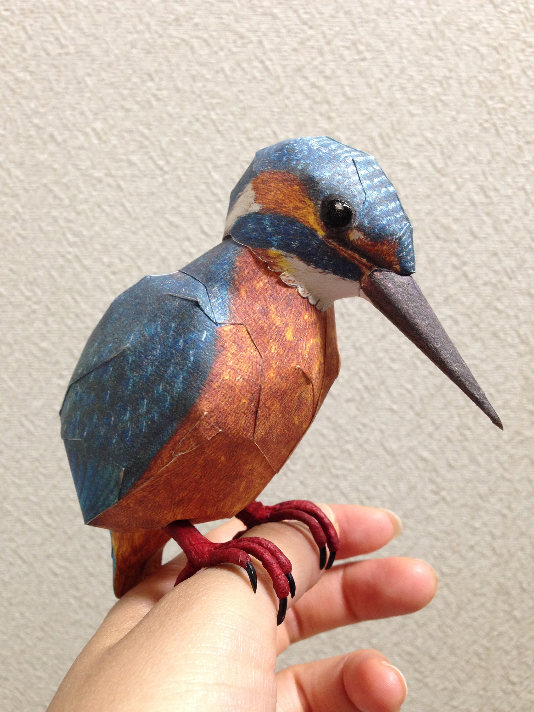 ペーパークラフト カワセミ <展開図掲載サイト様> http://www.johanscherft.com/papercraft.html 無料・有料で展開図公開中。 無料でもクオリティ非常に高し。 全体像 今回は、タント紙に展開図を印刷したものを使ってボディを作成。 後ろ 横 目にはタミアクリアーで光沢を 足 体の割りに現物の2倍近く大きくなってしまった足…orz (カーテンレールにつかまらせて飾りたかったんです) 材料は、アルミ針金と和紙。 アルミ針金の先を研ぎ爪を成型。そこにアクリル塗料を塗り、色と艶を。 また、足のお肉部分(赤い部分)は細く切った和紙を針金にグルグルに巻きつけて 鳥足特有のムニムニゴツゴツ感を表現。 針金なので多少稼動可能で、棒状のものに掴まることができます。 無料でこのクオリティはなかなか! パーツ数も少ないので気軽に組むことができます。 海外のリアル系鳥ペーパークラフトはホントレベル高いですね。 以上、ペーパークラフトカワセミでした。 |